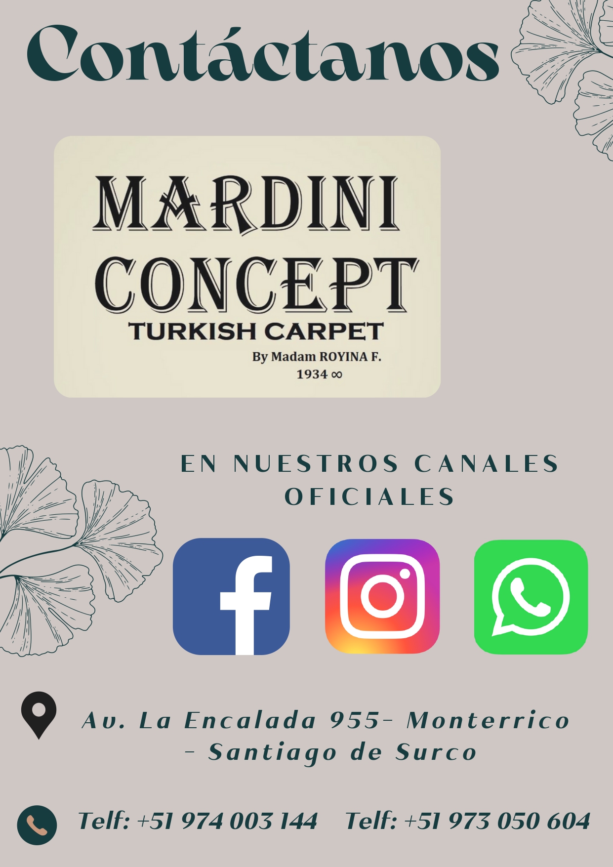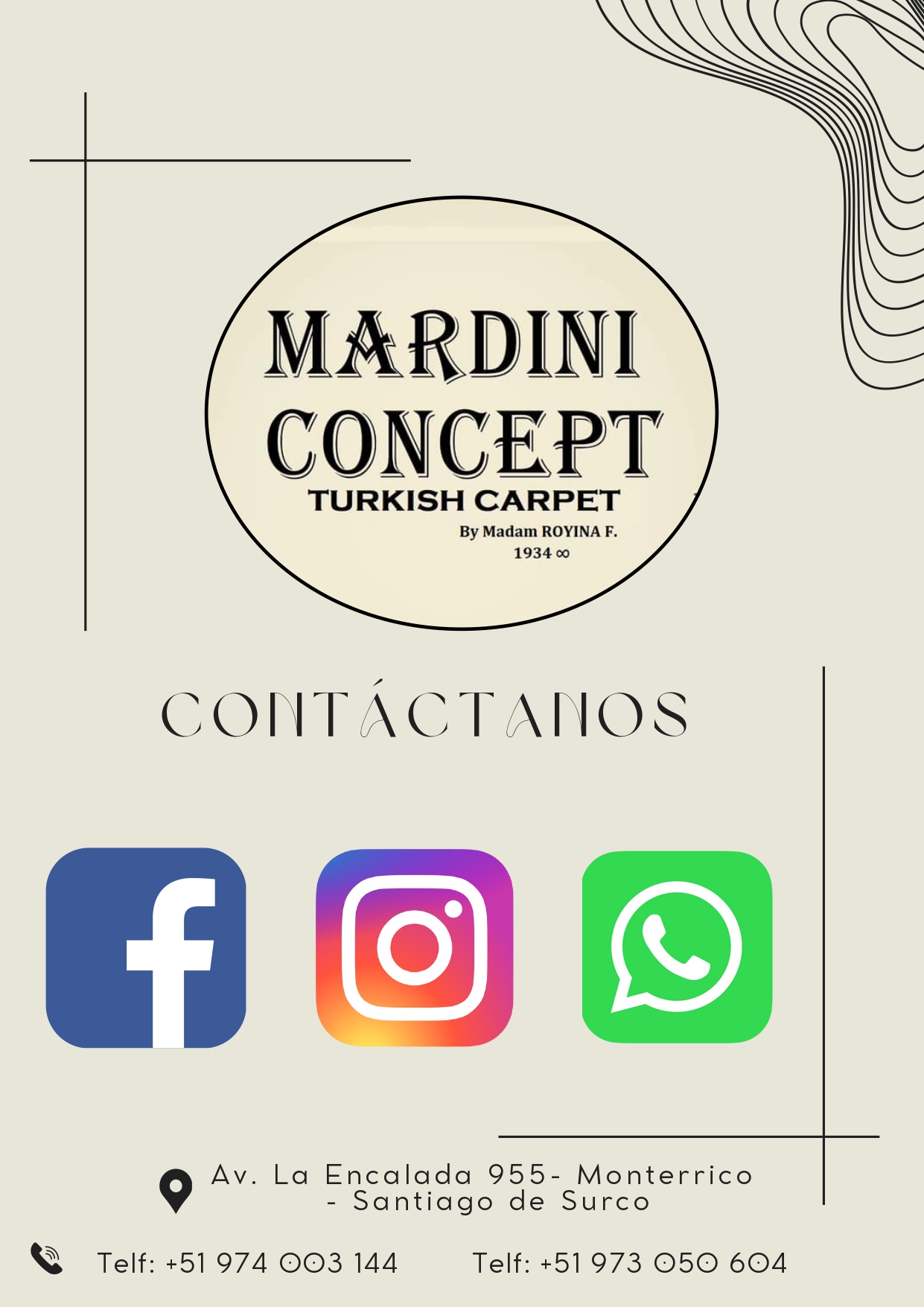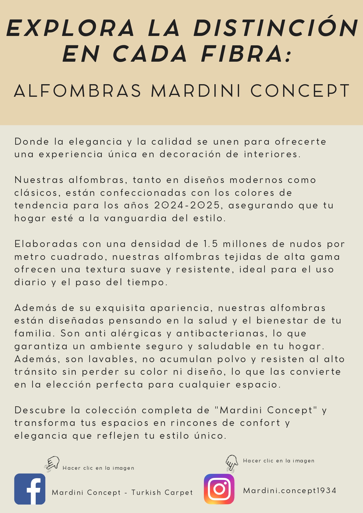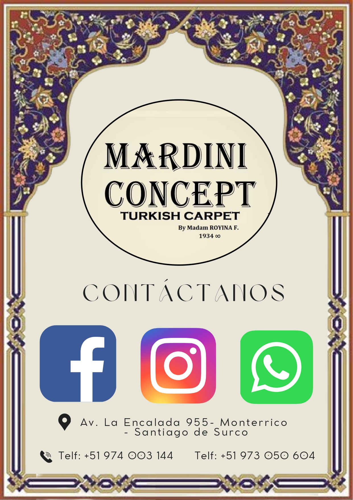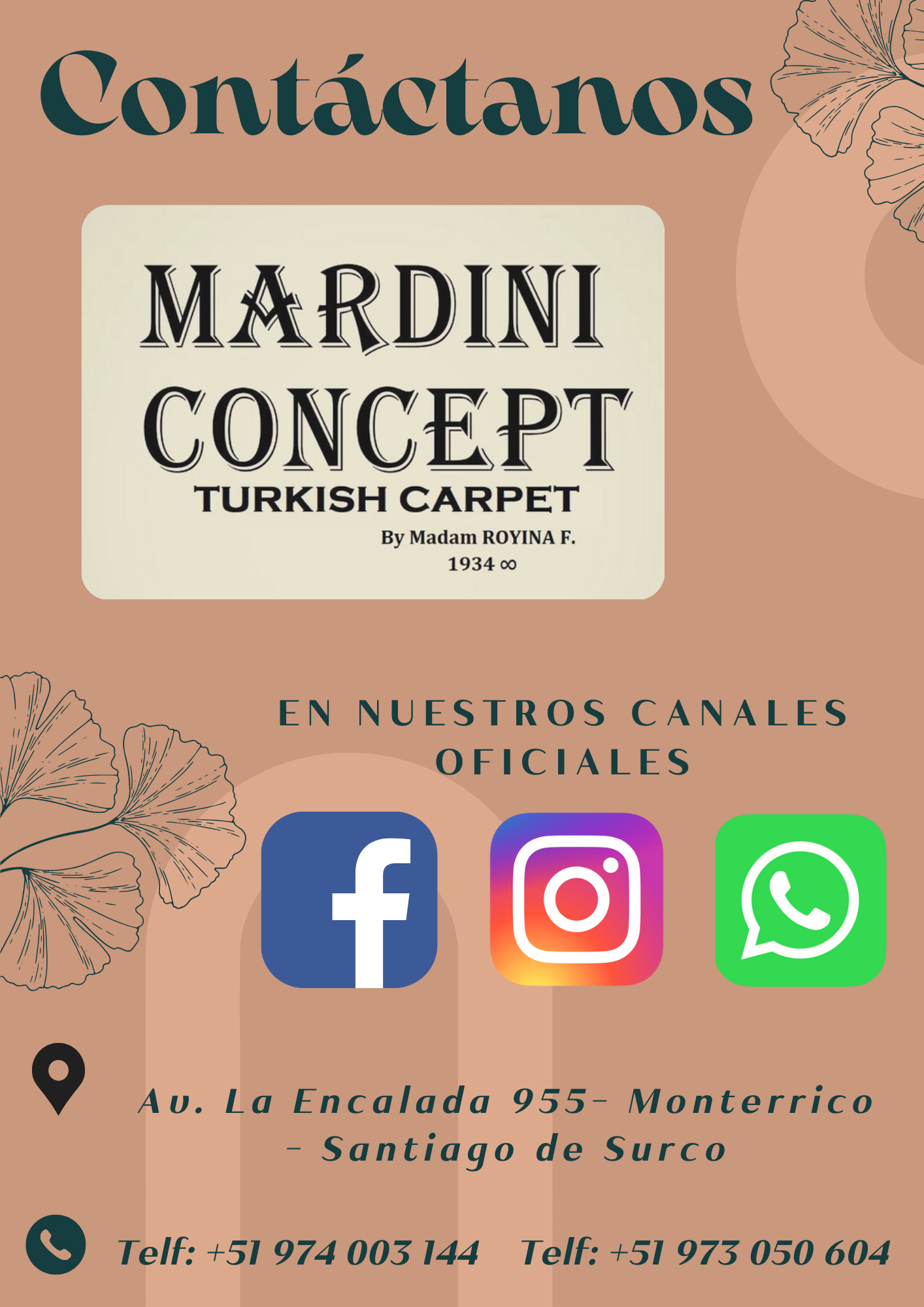 Síguenos SeguirSeguirSeguirSeguirSeguir Nuestros Servicios Alfombras Turcas modernas y clásicas de Mardini Concept. Alfombras tejidas a máquina con el estilo de las elaboradas a mano. Variados colores y diseños fabricadas con hilos naturales, antibacteriales y antialérgicos. comunícate con nosotros WhatsApp Teléfono Correo Guárdame Guardar Código QR Fotos Catalogo Alfombras Exclusívas Catalogo Alfombras de Seda Catalogo Alfombras Modernas Mardini Concept Catálogo Alfombras Pasadizos Catálogo Clásicas Mardini Concept Catálogo de Alfombras pequeñas y medianas Videos DESARROLLADO POR: