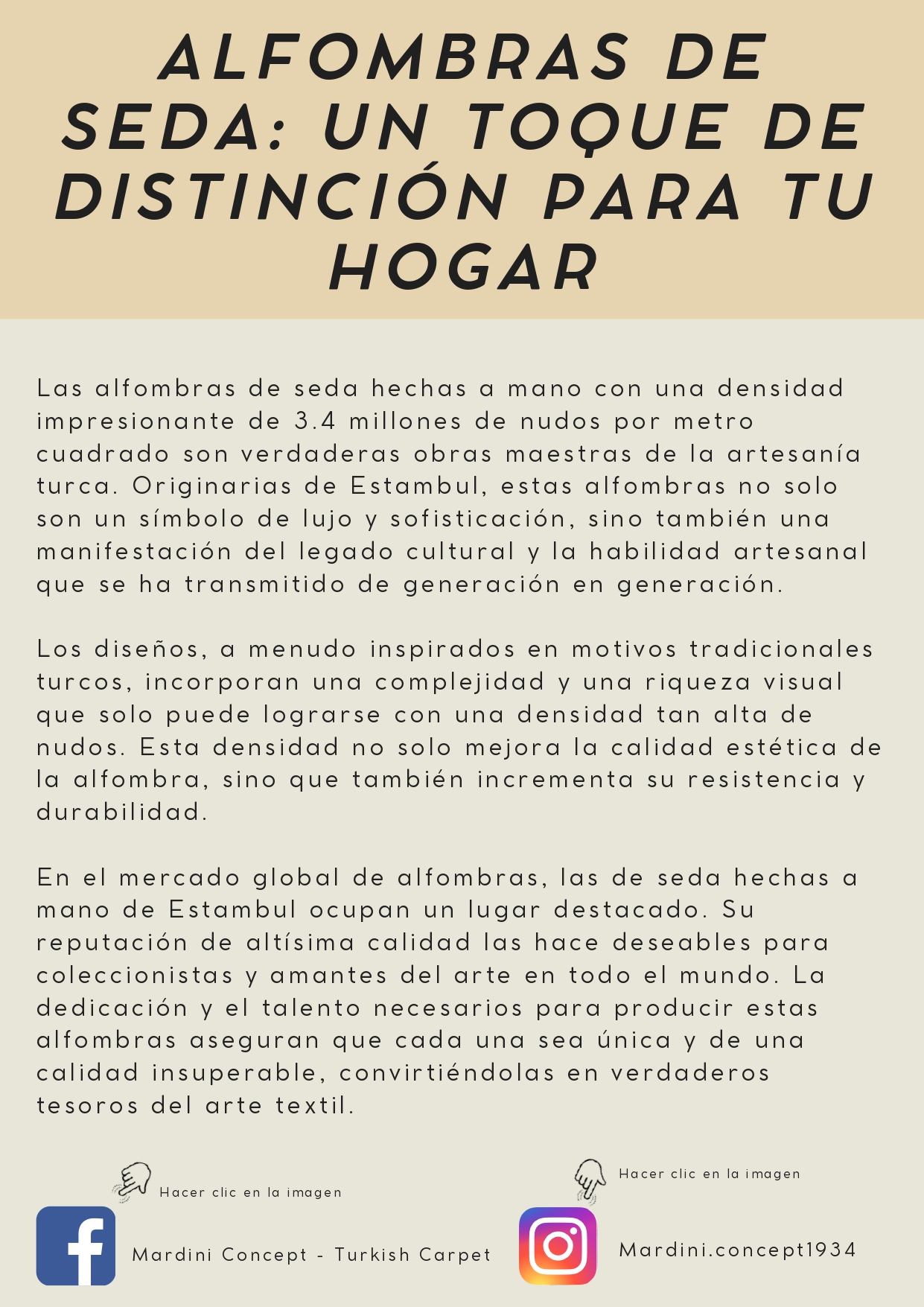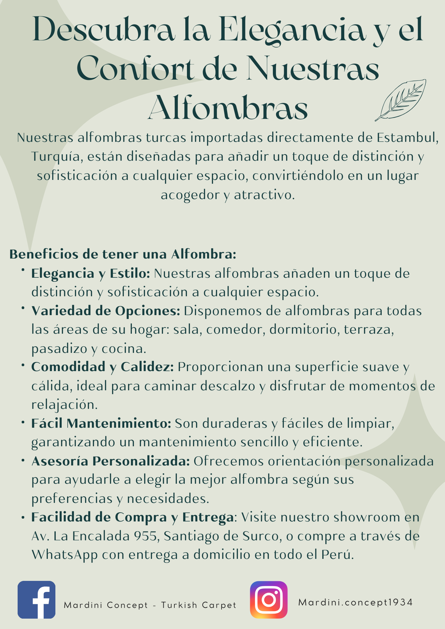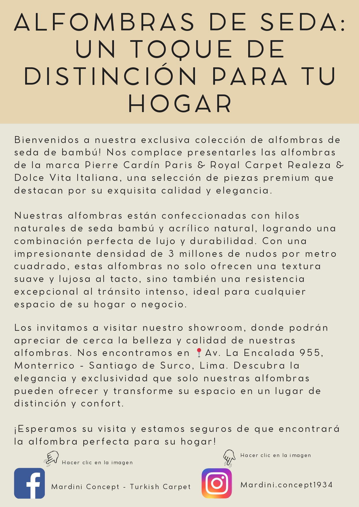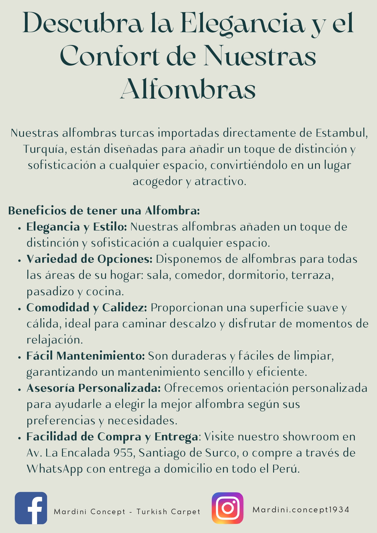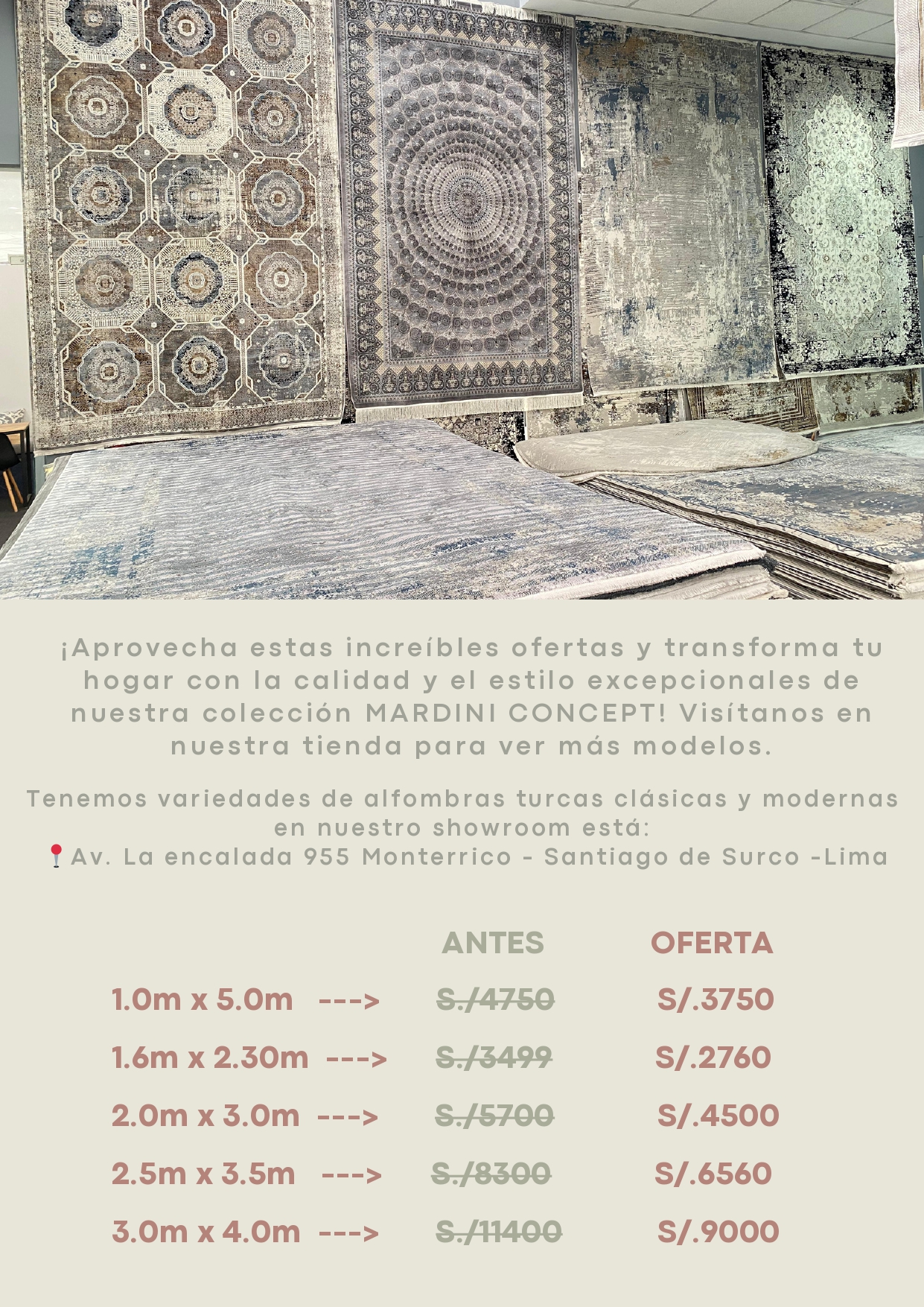 Síguenos SeguirSeguirSeguirSeguirSeguir Nuestros Servicios Alfombras Turcas modernas y clásicas de Mardini Concept. Alfombras tejidas a máquina con el estilo de las elaboradas a mano. Variados colores y diseños fabricadas con hilos naturales, antibacteriales y antialérgicos. comunícate con nosotros WhatsApp Teléfono Correo Guárdame Guardar Código QR Fotos Catalogo Alfombras Exclusívas Catalogo Alfombras de Seda Catalogo Alfombras Modernas Mardini Concept Catálogo Alfombras Pasadizos Catálogo Clásicas Mardini Concept Catálogo de Alfombras pequeñas y medianas Videos DESARROLLADO POR: